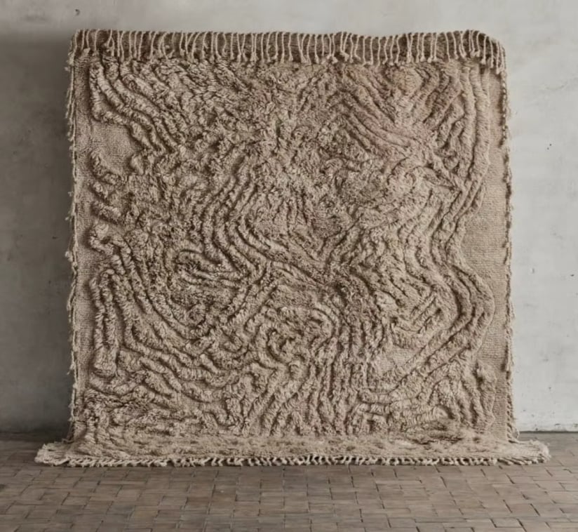 Featuring a subtle geometric pattern in neutral tones. Made from durable, soft wool by skilled artisans in Hokkaido. Its texture adds warmth and acoustic comfort to any room. The natural dyes ensure colors will mellow gracefully over time. A foundation piece for living spaces or bedrooms. 145,000 JPY.